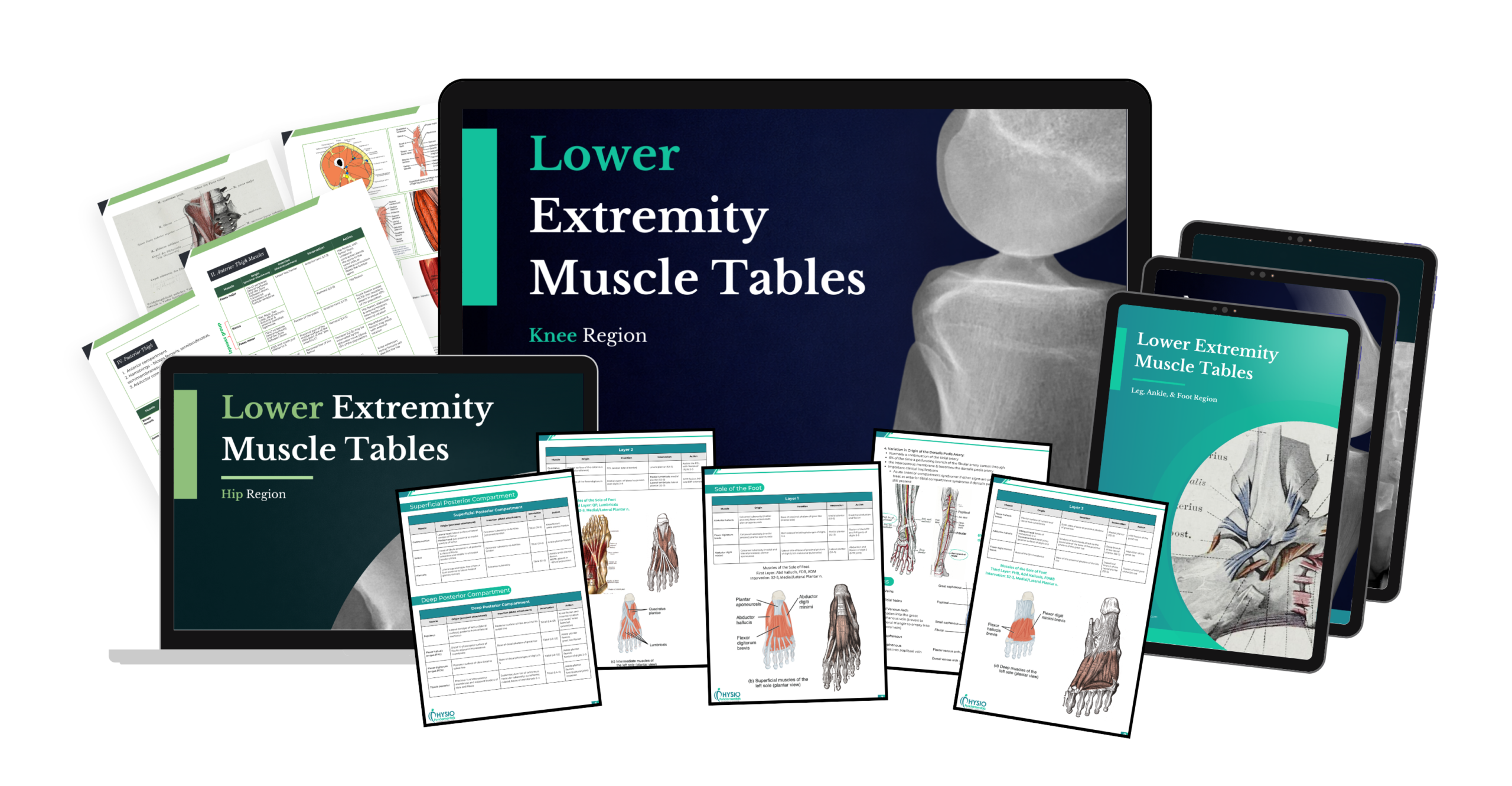 Just the muscle tables from all lower extremity regions for quick reference and memorization. Includes anatomical illustrations to enhance understanding of origins, insertions and regional connects.